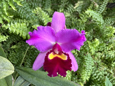 紫桃色 L濃紫紅色と黄色 花が少なくなる初夏咲きのラベンダー系カトレアで大輪強健種 サンフランシスコ・ロッドマクレラン作出優秀個体です。 |