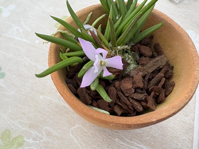 S、Pやや薄茶色を帯びた白色 L赤褐色 花径約5mmの花を約20cm下垂した花茎に20輪前後つけます。かんざしに似た可憐花 ほふく茎が上に伸び面白い株姿 夏〜秋咲き フィリピン原産 |