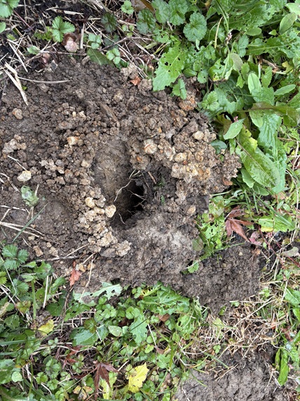 2025年12月23日 この時期になると草が無くなるせいかモグラの山が目につきます。ところが、このように穴が開いたのは初めて見ました。中から出て行ったのか?たまに猫に捕まった物が転がっていることがありますが。鴨川には色々な動物が住んでいます。 |