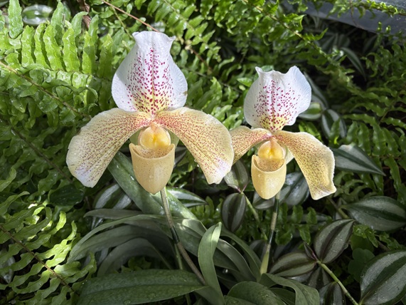 世界らん展・ボルネオ展示で飾り、我が家に帰ってきました。この子はこの展示に合わせたように咲いてくれ、大変に尽力した影の功労者です。現地のボルネオでは少なく、見かけることが無くなっているそうです。ロスチャイルディアナムは男性的で、「パフィオペディラムの王様」ですが、ストーネイは貴婦人のような品のある美しい花ではないかと思います。いつまでも大切にしたい原種です。
