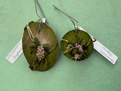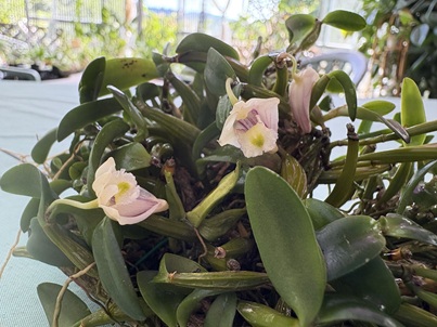 バンダの仲間でベトナム原産です。緑と白のコントラストが大変良く、爽やかできれいな花です。樹勢は丈夫で意外と作りやすいことが分かりました。ベトナムにもまだまだ色々な原種があるようです。下2つと共に単茎性種ですが、当園のお客様の中にはこれらのグループにこだわってコレクションされている方もいらっしゃいますが、いい楽しみ方の一つではないかと思います。