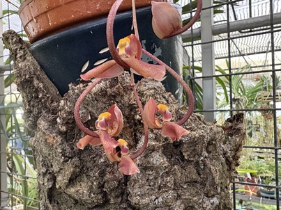 本属は南米コロンビアとエクアドル、ペルー原産の原種をかけ合わせした交配種です。親はmacroplectron と speciosa で、ピンクからオレンジピンクの花が咲いています。オンシジュームやイオノプシスの仲間で通気を好み、根は特に露出した方が良く、空気に触れさすことが大切です。可憐な美しさがあり、針金のような細い茎に花を多数つけます。株は意外と丈夫ですが、夏は涼しい場所で栽培します。
