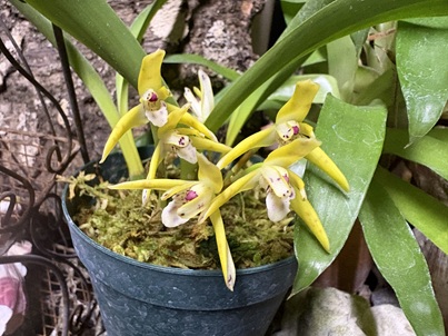 本属は東南アジアに約30種分布するセロジネの近縁属です。この株はアメリカの蘭園から輸入したものですが、初めて咲いてくれました。掲載にあたり詳細を調べてみましたがキュー植物園のサイトにも記載がなく、他のサイトにも全く見あたらず、現在のところ原産地などの詳細は分かりません。草丈約8cm、一輪の花の大きさは幅7mmと小さな原種です。